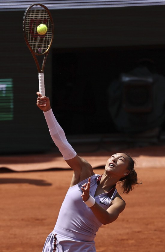 6月3日,鄭欽文在比賽中發(fā)球。新華社記者 李京 攝
