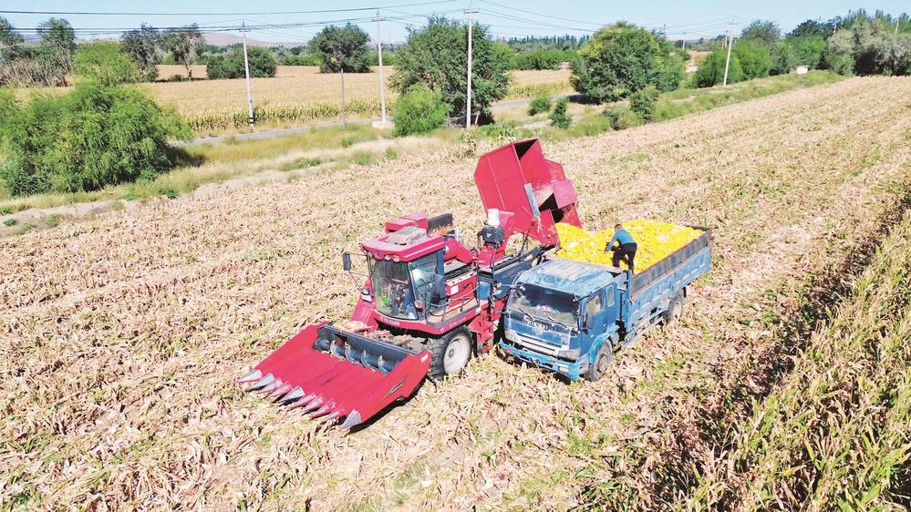 在烏達(dá)區(qū)烏蘭淖爾鎮(zhèn),農(nóng)機(jī)手駕駛收割機(jī)在農(nóng)田里收割玉米。