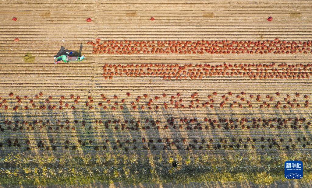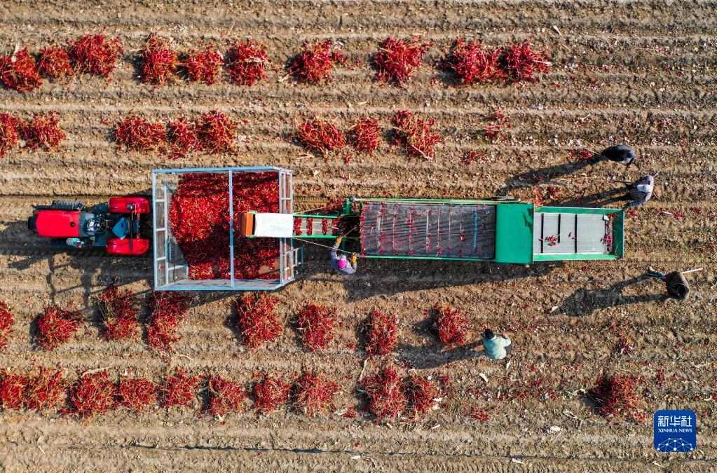 10月25日,在開魯縣東風(fēng)鎮(zhèn)東方紅村,村民在田間收獲紅干椒(無人機照片)。新華社記者 連振 攝