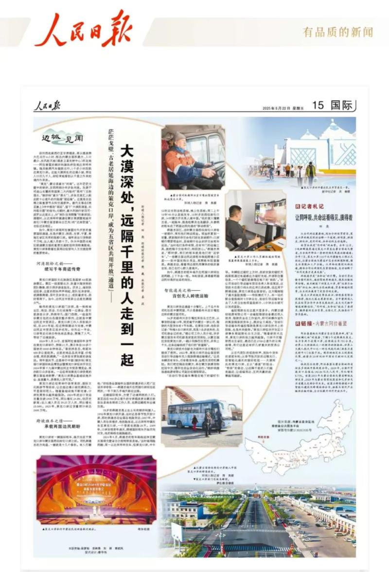 8月22日,《人民日?qǐng)?bào)》國(guó)際版“邊城見聞”專欄整版聚焦阿拉善盟策克口岸,以小故事小切口,見證阿拉善盟與周邊經(jīng)貿(mào)往來、人文交流的生動(dòng)實(shí)踐,展示了阿拉善盟高水平對(duì)外開放取得的豐碩成果,唱響了一曲親誠(chéng)惠容行大道、命運(yùn)與共開新篇的贊歌。全文如下:
