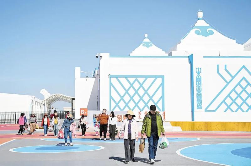 雄偉的策克口岸國(guó)門東側(cè),是一排排商業(yè)區(qū),商店、飯店、文化設(shè)施等一應(yīng)俱全,假日里游客眾多,熱鬧非凡;國(guó)門西側(cè),一座座形似蒙古包的白色建筑整齊排列,這就是中蒙邊民互市貿(mào)易區(qū)。策克口岸工作人員張銳介紹,自2014年起,經(jīng)過持續(xù)建設(shè)與完善,中蒙邊民互市貿(mào)易區(qū)逐步成形。依托這一平臺(tái),口岸常態(tài)化舉辦特色商品展會(huì),聚集了人氣,帶動(dòng)了邊境旅游。