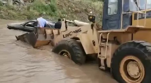 洪水還在上漲,經(jīng)研判分析,洪水仍在可控范圍內(nèi),為減少損失,兩位民警再次冒著生命危險,同裝載機一同下水,用繩索系牢越野車,將被困越野車拖上岸邊。