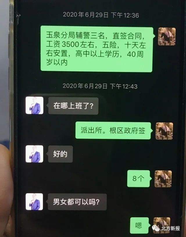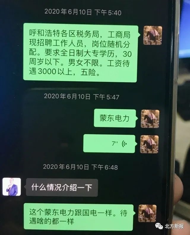 “呼和浩特各區(qū)消防大隊(duì)招聘辦公室內(nèi)勤人員,工資待遇3500元左右。”“高速交警呼市支隊(duì)(一支隊(duì))輔警,工資和五險(xiǎn)一金,4200元?!薄昂艉秃铺馗鲄^(qū)稅務(wù)局、工商局現(xiàn)招聘工作人員,崗位隨機(jī)分配。”“呼和浩特婦幼保健院招聘護(hù)士,大專學(xué)歷”……記者在民警繳獲的程某某的手機(jī)上看到,6月8日以來,程某某和趙某某的聊天記錄中,發(fā)送了多條諸如此類的招聘信息。