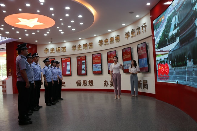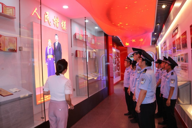 習(xí)近平新時(shí)代中國特色社會主義思想實(shí)踐基地由四子王旗委政府于2021年5月建成,總面積460平米,展廳內(nèi)展出圖片241張、文字展板34塊、視頻資料12個(gè),分黨史學(xué)習(xí)教育、都貴瑪先進(jìn)事跡、新時(shí)代文明實(shí)踐中心三個(gè)展廳,力圖打造成鞏固民族團(tuán)結(jié)大局、鑄牢中華民族共同體意識的紅色教育主陣地。在黨史學(xué)習(xí)教育展廳,全體黨員民警通過多媒體技術(shù),深入了解了黨的歷次代表大會主要內(nèi)容、我們黨理論探索的發(fā)展歷程和中國共產(chǎn)黨人的精神譜系以及習(xí)近平總書記對內(nèi)蒙古的重要囑托,重溫了習(xí)近平總書記“七一”重要講話精神,引導(dǎo)黨員民警牢記初心使命,時(shí)刻銘記黨性是黨員立身、立業(yè)、立德的基石。在都貴瑪先進(jìn)事跡展廳,大家通過視頻、照片、文字、連環(huán)畫等方式細(xì)致了解了“草原母親”都貴瑪養(yǎng)育28名孤兒和挽救40多位產(chǎn)婦的感人事跡,共同回憶了都貴瑪老人與邊防官兵、移民管理警察相處的點(diǎn)點(diǎn)滴滴。大家被都貴瑪老人身上“初心如炬 大愛無疆”的精神深深折服,深切感受到榜樣的力量。在新時(shí)代文明實(shí)踐中心展廳,大家還了解到駐地四子王旗新時(shí)代文明實(shí)踐工作的重要舉措和成果,通過對照人民楷模和道德模范,深入開展深刻檢視,進(jìn)一步強(qiáng)化了黨員民警建設(shè)美麗邊疆、維護(hù)安全穩(wěn)定的信心決心。