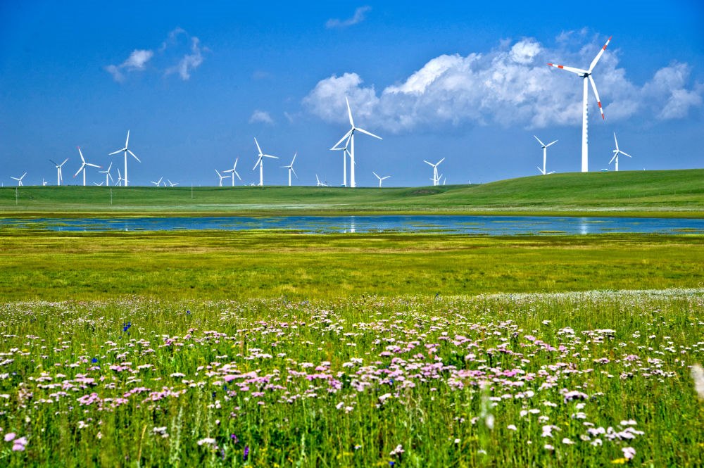 “輝騰錫勒”蒙古語意為“清涼的山崗”,因風(fēng)力資源豐富而得名,是建設(shè)風(fēng)電場理想的場所。如今,一排排風(fēng)電機(jī)猶如“白色森林”,碩大的風(fēng)翼就像一架架“大風(fēng)車”,在草原勁風(fēng)吹動(dòng)下緩緩轉(zhuǎn)動(dòng),形成另一大景觀。