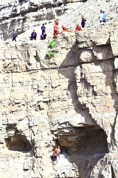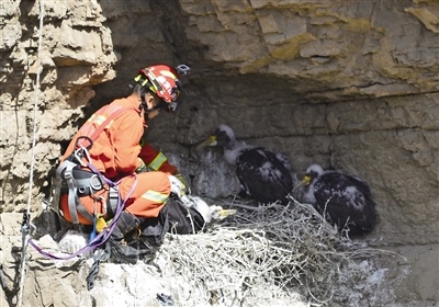 當(dāng)天7時左右,在烏海市海勃灣區(qū)甘德爾山景區(qū)半山腰處,攝影愛好者焦長青在拍攝時發(fā)現(xiàn)了一窩出生20多天的幼年野生黑鸛,其中一只黑鸛行動異常,疑似受傷。他立即撥打了119報警電話,同時聯(lián)系了烏海市野生動物保護(hù)部門。9時許,烏海市消防支援支隊(duì)光明路特勤站和烏海市野生動物保護(hù)部門的工作人員到達(dá)現(xiàn)場。經(jīng)勘查,在距離懸崖正下方大約30米處的巖洞內(nèi),一只幼年黑鸛被尼龍繩纏繞住腿部而受傷,不能行動。消防員隨后尋找合適的位置制作錨點(diǎn)。消防員陳意攜帶救援裝備速降到懸崖下方展開營救,一個小時之后,受傷的幼年黑鸛被成功救出,并送往海勃灣區(qū)林業(yè)草原局救助站進(jìn)行救治。
