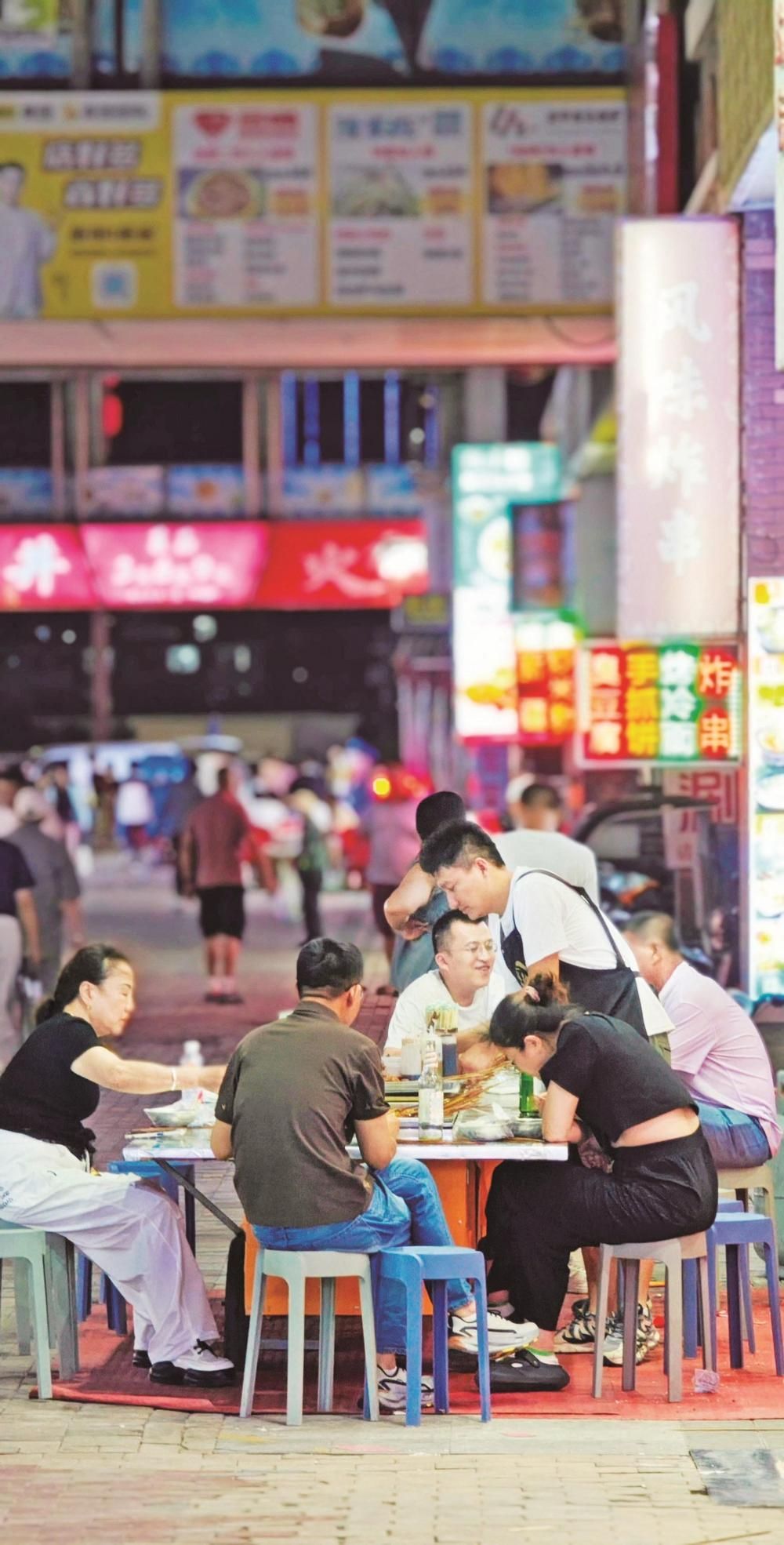炭火上的羊肉串嗞嗞作響,油脂滴落,迸出金色火花,散發(fā)出誘人的香氣??腿藝谒芰闲∽琅裕掷锬弥?zhèn)啤酒,碰杯傳出清脆的響聲……這里沒有高檔餐廳的拘謹(jǐn),只有朋友相聚的歡樂和大口吃肉的暢快。大學(xué)生徐瑞虹放暑假后,經(jīng)常和朋友來(lái)夜市消暑。“我們幾個(gè)沒事就來(lái)萬(wàn)達(dá)金街轉(zhuǎn)一轉(zhuǎn),天太熱了,待在家里也悶,而且夜市里的這些小吃我們都比較喜歡,沒事幾個(gè)人喝幾瓶啤酒,聊一聊天,感覺還是很愜意的?!睂?duì)于年輕人來(lái)說(shuō),夜市不僅是美食的聚集地,更是釋放壓力、享受生活的好去處。在這里,他們可以暫時(shí)拋開煩惱,盡情享受美食帶來(lái)的快樂。