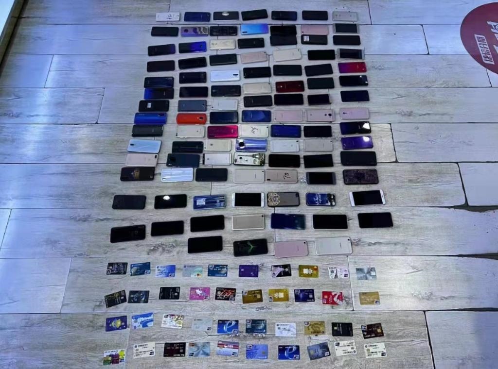 這是民警現(xiàn)場查扣的手機、銀行卡等部分作案工具。(受訪單位供圖)