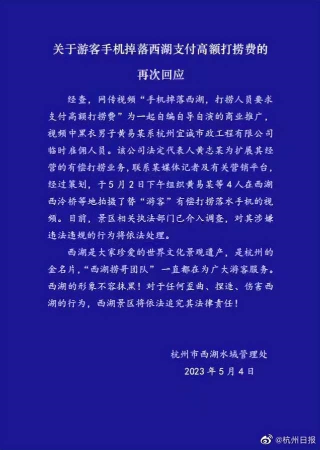 ·西湖景區(qū)再次回應“高價撈手機事件”:為自編自導自演商業(yè)推廣。