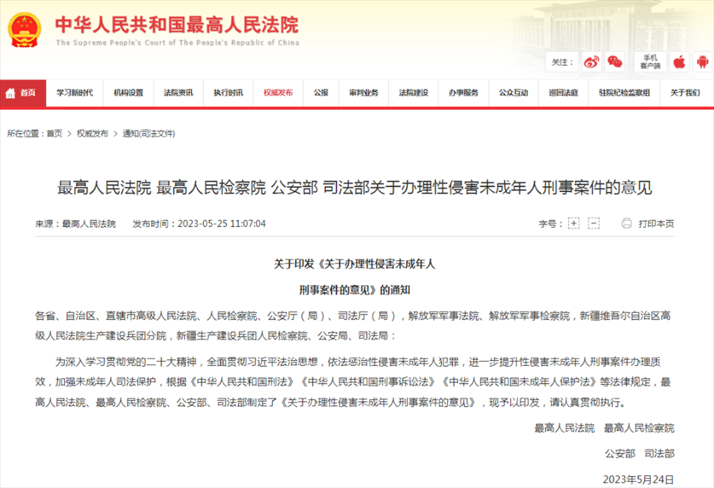 最高人民法院、最高人民檢察院25日聯(lián)合發(fā)布關于辦理強奸、猥褻未成年人刑事案件適用法律若干問題的解釋。最高人民法院、最高人民檢察院、公安部、司法部聯(lián)合發(fā)布關于辦理性侵害未成年人刑事案件的意見。