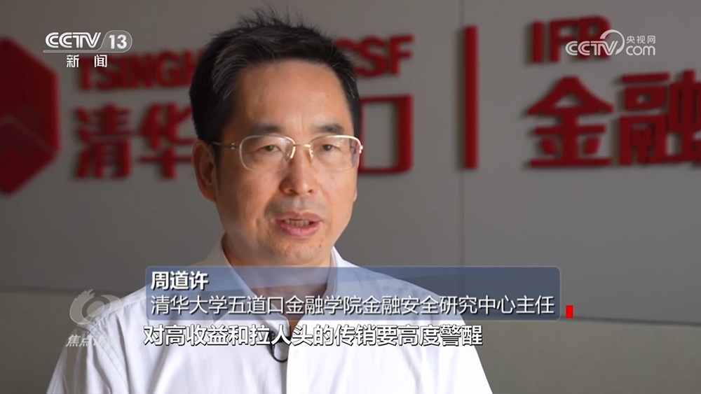 清華大學五道口金融學院金融安全研究中心主任周道許:“有兩個明顯的特征,第一個就是高回報、高收益率,誘使人投資他的項目,一般會采取傳銷拉人頭的方式來推銷他的產(chǎn)品。對高收益和拉人頭的傳銷要高度警醒,同時要借助專業(yè)的力量,頭腦一發(fā)熱錢就砸進去了,后悔就太晚了?!?/p>