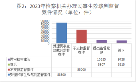 2023年,全國檢察機關始終堅持以習近平新時代中國特色社會主義思想特別是習近平法治思想為指導,認真貫徹落實《中共中央關于加強新時代檢察機關法律監(jiān)督工作的意見》,以“高質效辦好每一個案件”作為履職辦案的基本價值追求,以專業(yè)化建設為基礎,以提升辦案能力和水平為目標,認真貫徹實施民法典,扎實推進民事生效裁判監(jiān)督、審判活動監(jiān)督、執(zhí)行活動監(jiān)督、支持起訴、虛假訴訟監(jiān)督等各項工作,在完善案卷調閱制度、民事再審檢察建議制度、促進社會治理等方面取得新進展新成效。