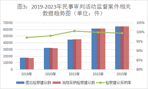 2023年,全國檢察機關共受理民事審判活動監(jiān)督案件6.94萬件,同期審結6.96萬件(含積存)。提出檢察建議6.47萬件,同比上升5.1%,占審結案件數(shù)的93%,同比增加4.2個百分點。對提出的檢察建議,法院同期采納6.46萬件,檢察建議采納率達99%。一些地區(qū)通過開展專項監(jiān)督,加強辦案力度,提高辦案效果,推動民事審判活動監(jiān)督向深層次違法監(jiān)督轉變。