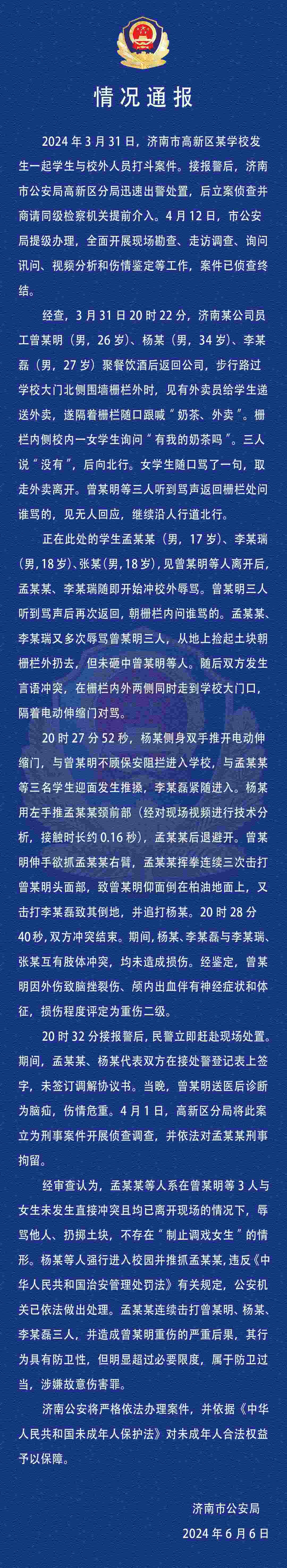 學(xué)生與醉漢沖突、被拘留 濟(jì)南警方:涉事學(xué)生屬于防衛(wèi)過(guò)當(dāng)