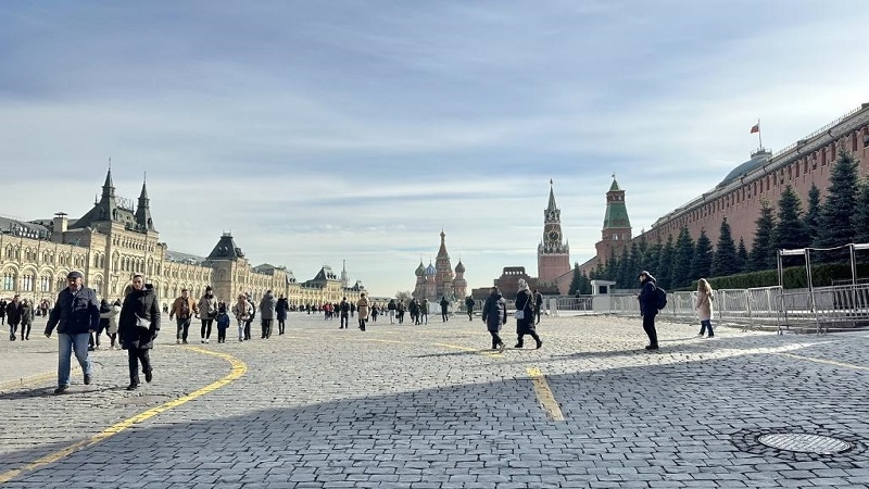 莫斯科紅場上,藍天白云,很多市民趁著好天氣外出游玩。