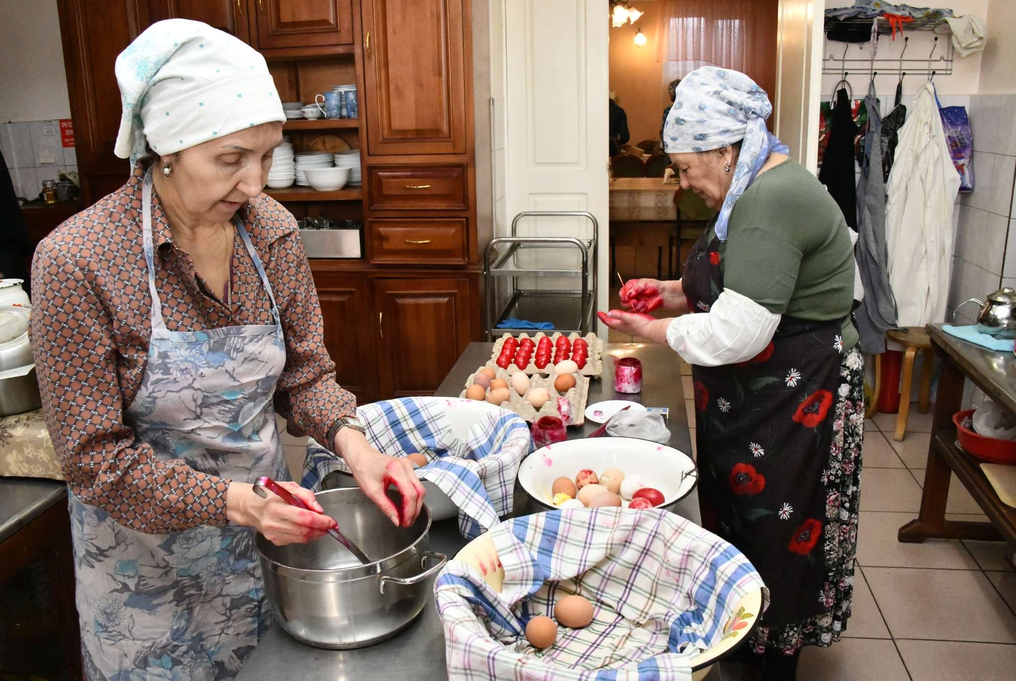 當?shù)貢r間2023年4月13日,俄羅斯扎貝卡爾斯基地區(qū),阿塔馬諾夫卡定居點的一修道院內(nèi),民眾在制作東正教復活節(jié)前的傳統(tǒng)煮雞蛋。視覺中國