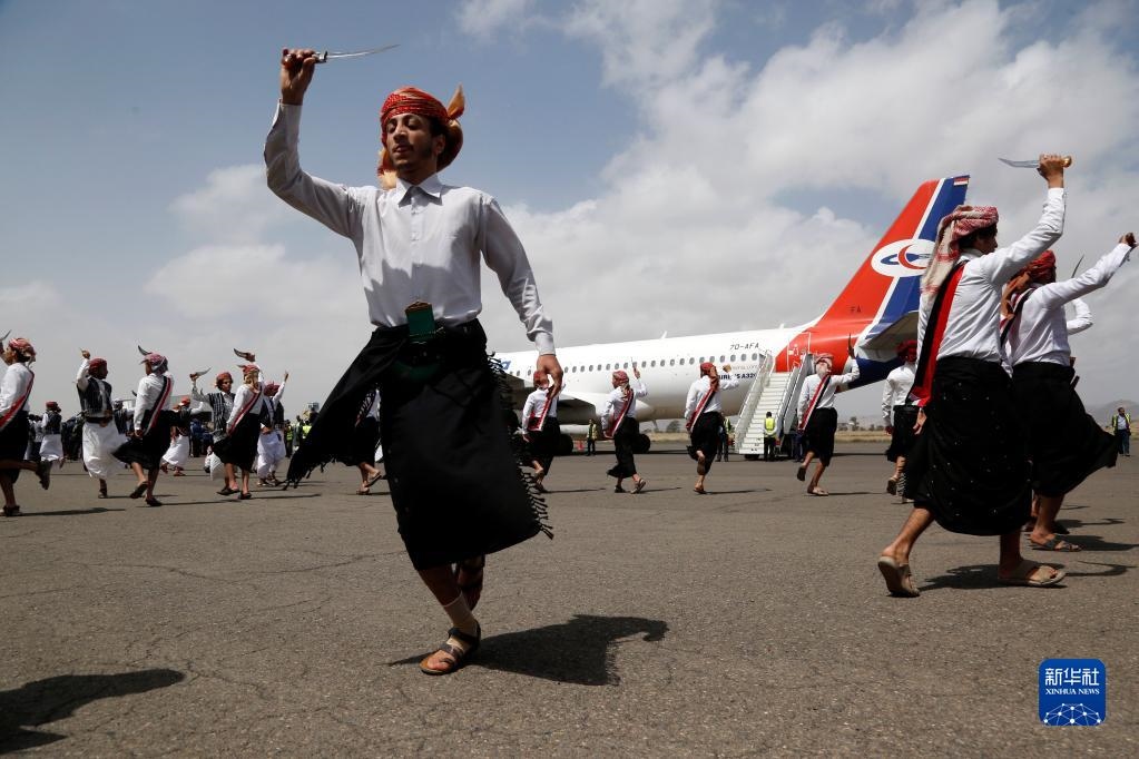 4月15日,在也門薩那機(jī)場,人們在歡迎戰(zhàn)俘歸來的儀式上跳舞。