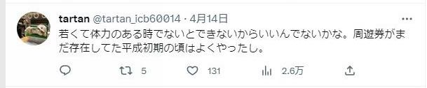 “只有年輕體力好的時(shí)候才能(這樣旅游),挺好的。在還有周游券的平成年代初期,我也這么干過。”