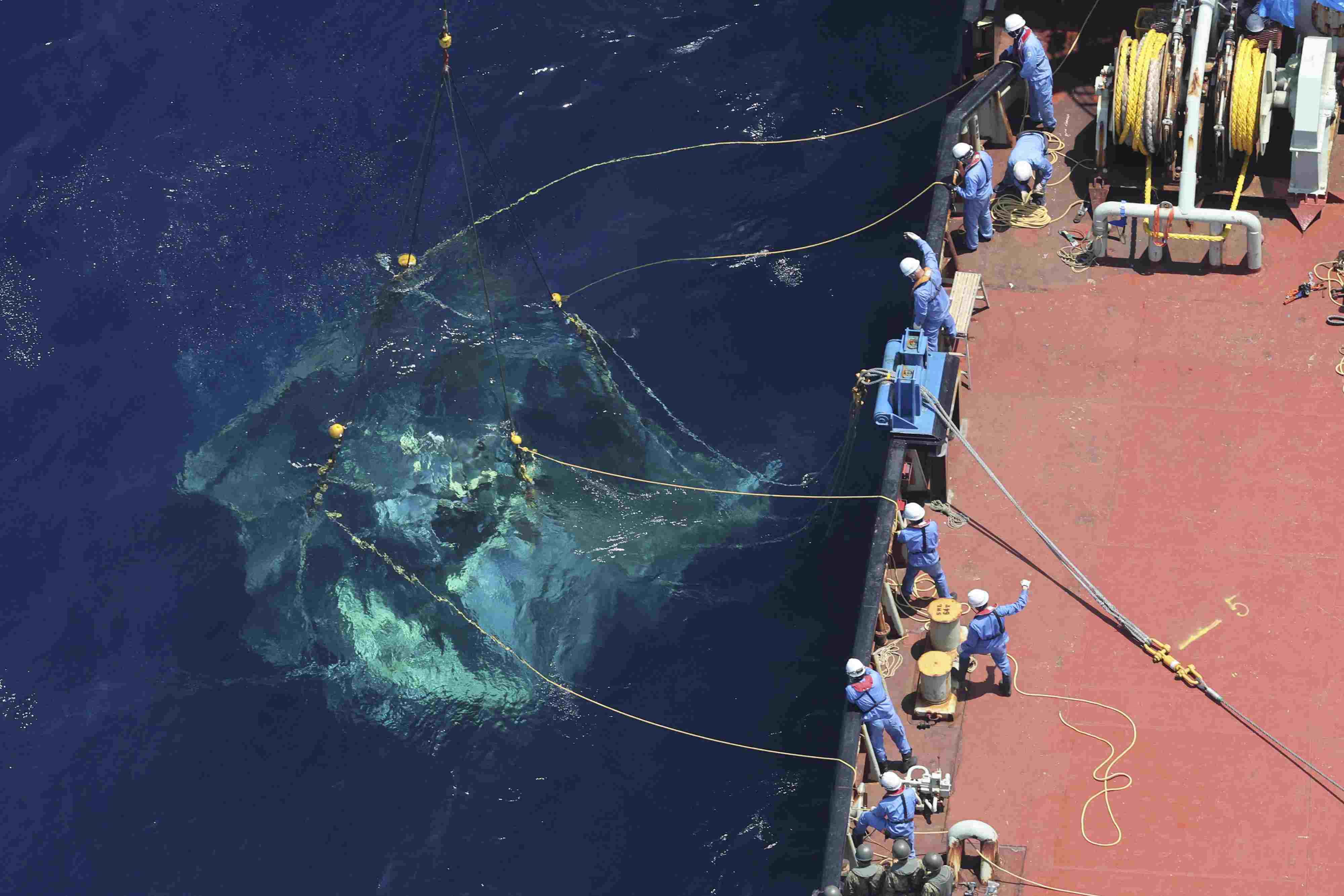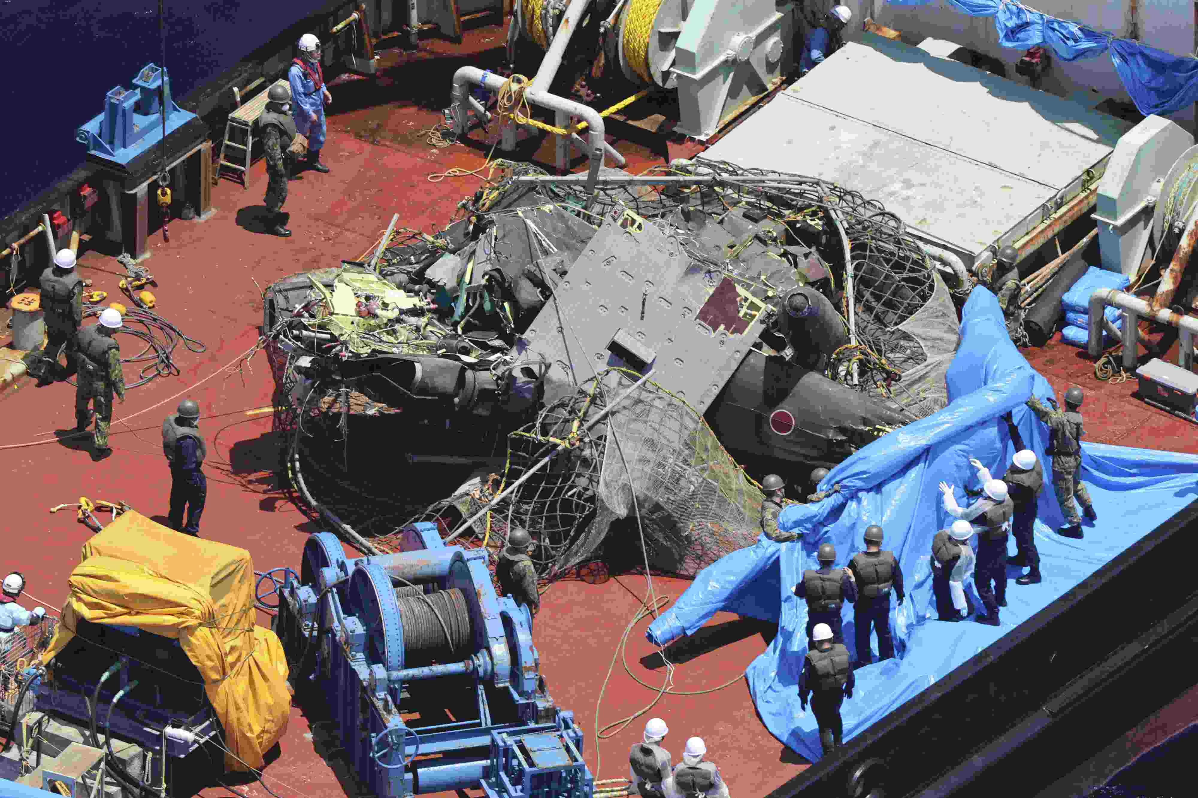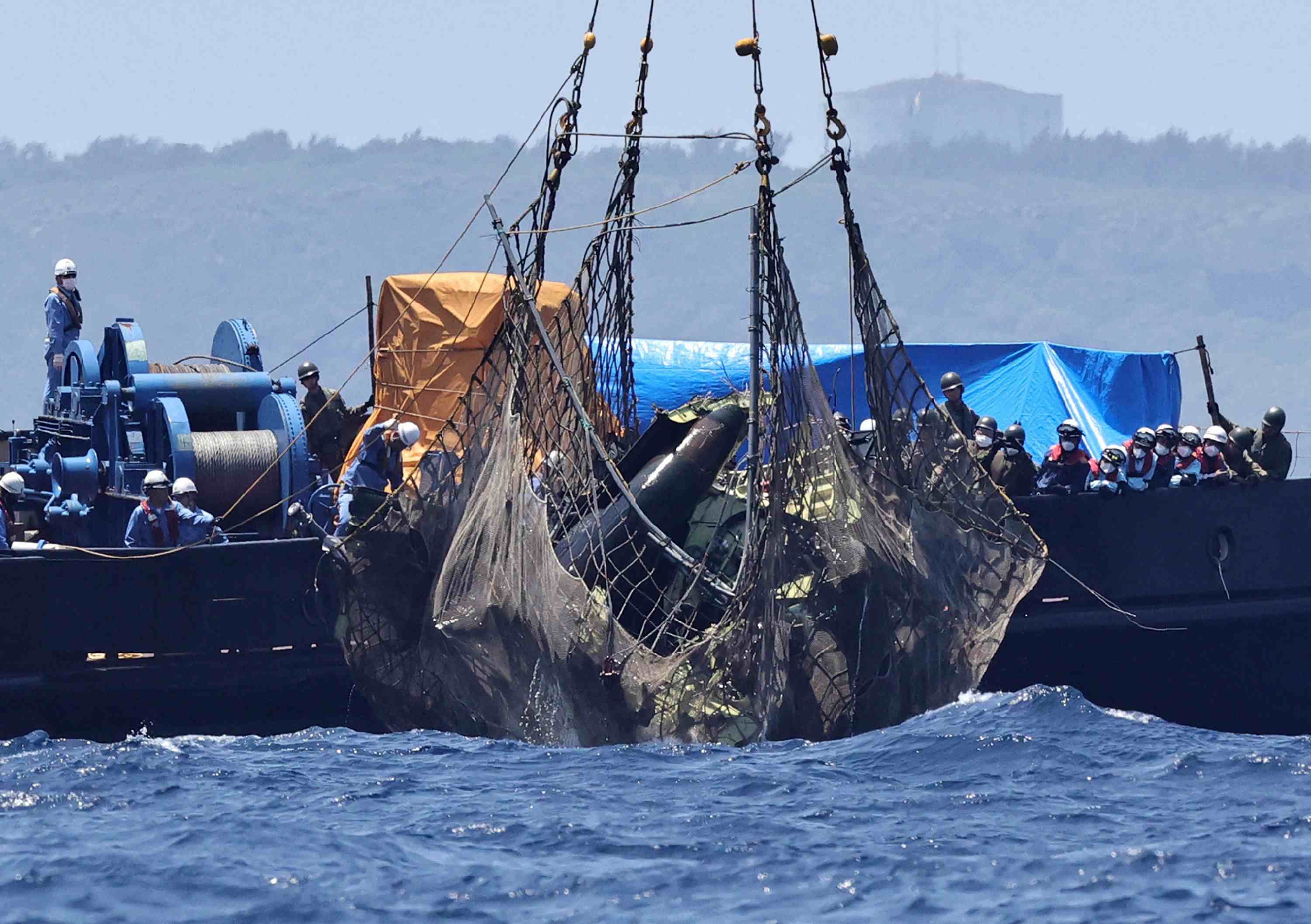 當(dāng)?shù)貢r間2023年5月2日,日本民間作業(yè)船于當(dāng)?shù)貢r間上午11時45分左右,將沖繩縣宮古島附近失事的日本自衛(wèi)隊直升機的機體打撈出海。據(jù)悉,一架日本陸上自衛(wèi)隊直升機4月6日在沖繩縣宮古島附近海域失聯(lián),失事直升機上共載有10人。 視覺中國