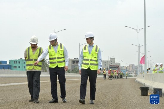 5月3日,姚堯(右)在孟加拉國(guó)達(dá)卡機(jī)場(chǎng)高架快速路項(xiàng)目上工作。新華社發(fā)