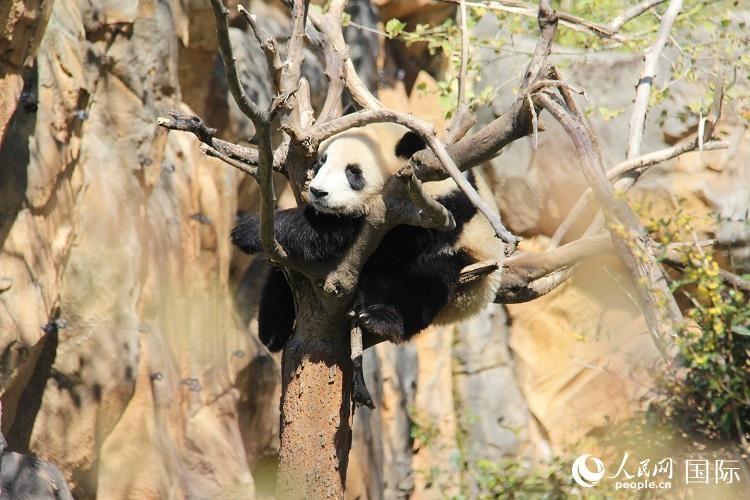 正在樹杈上睡覺的大熊貓“圓嘟嘟”。人民網(wǎng)記者 劉玲玲攝