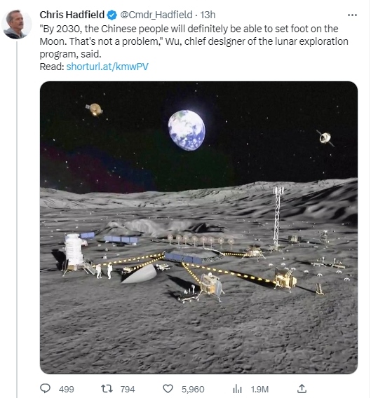 據(jù)報道,加拿大航天局前宇航員克里斯·哈德菲爾德在社交媒體推特上轉(zhuǎn)發(fā)了CGTN的一篇報道,他同時寫道,“中國探月工程總設(shè)計師吳偉仁說,‘到2030年,中國人的足跡一定能夠踏上月球。這不是個問題?!?/p>