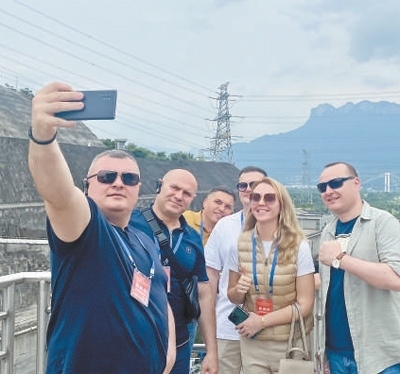 摩爾多瓦代表在宜昌市三峽船閘觀景臺上自拍。本報(bào)記者 王驍波攝