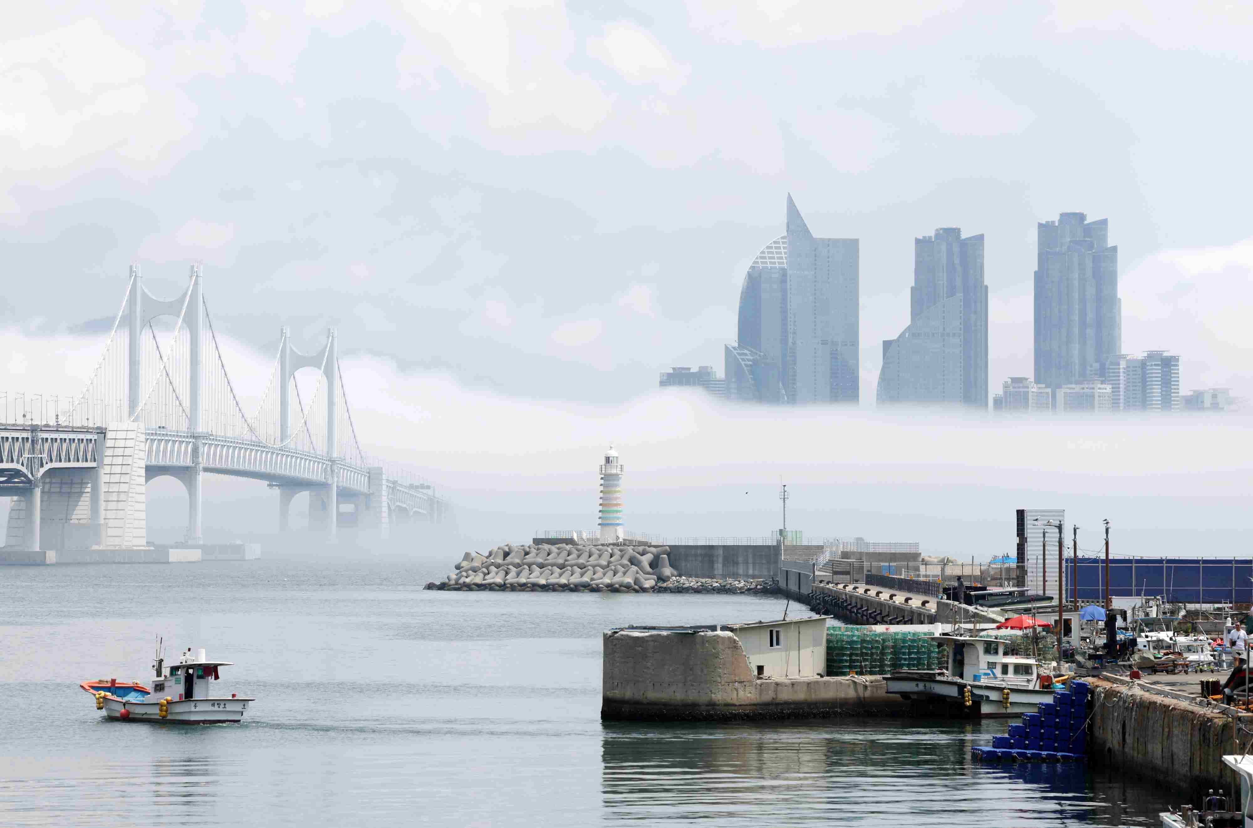 當(dāng)?shù)貢r(shí)間2023年6月12日,韓國(guó)釜山,廣安大橋一帶海霧彌漫,蔚為壯觀。 視覺(jué)中國(guó)