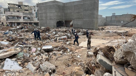 9月17日,國(guó)際救援人員在利比亞德?tīng)柤{的建筑廢墟上工作。新華社發(fā)(哈姆扎·圖爾基亞攝)