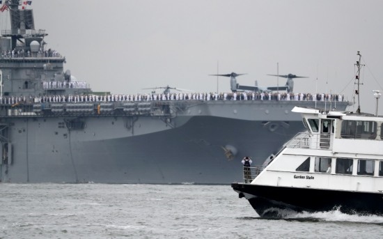 2017年5月24日,在美國紐約,美國海軍“基薩奇”號(hào)兩棲攻擊艦參加紐約艦隊(duì)周艦船巡游活動(dòng)。新華社記者王迎攝