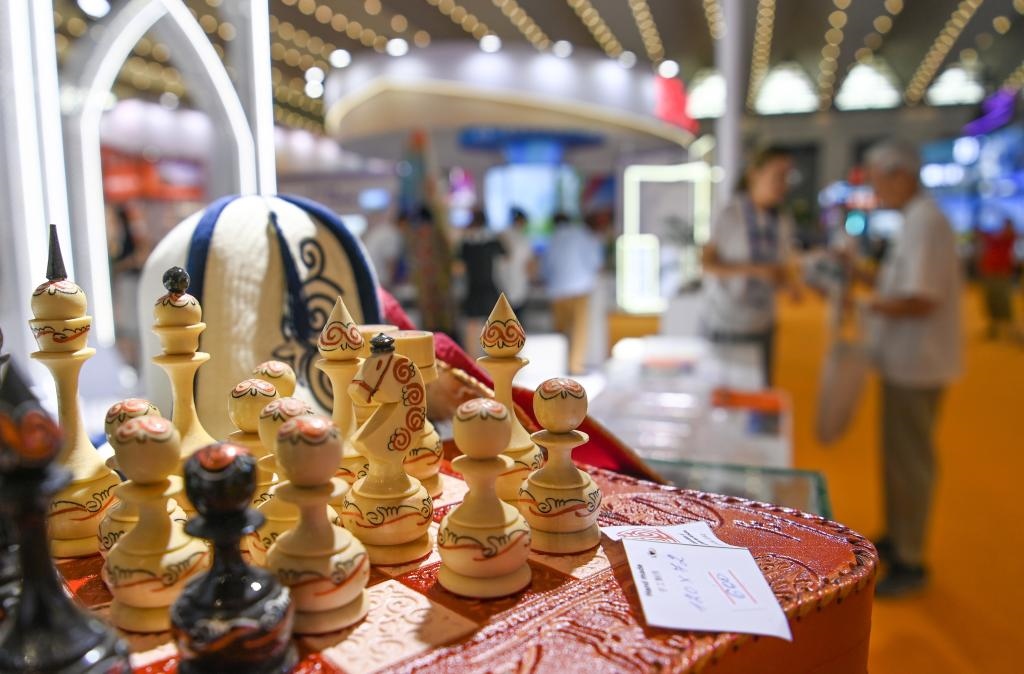 8月17日,參觀者在交流合作館吉爾吉斯斯坦展區(qū)了解特色商品。新華社記者 鄒競(jìng)一 攝