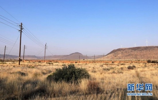 這是8月10日在南非北開普省德阿鎮(zhèn)拍攝的龍源南非公司德阿風(fēng)電項目風(fēng)機和輸電線路。 新華社記者 董江輝 攝