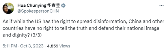 “仿佛美國有權(quán)利散布虛假信息,而中國等國家卻無權(quán)說實(shí)話、維護(hù)國家形象和尊嚴(yán)?”