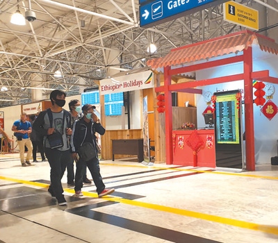 旅客經(jīng)過埃塞俄比亞博萊國(guó)際機(jī)場(chǎng)內(nèi)的中文服務(wù)臺(tái)。本報(bào)記者 萬 宇攝