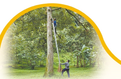 威猜站在十幾米高的榴蓮樹上,揮刀砍斷榴蓮與樹杈連接處,幾公斤重的榴蓮落了下來。樹底下,他的同伴緊盯著一個(gè)個(gè)從天而降的“刺球”,在它們落地前一瞬間,張開麻袋,穩(wěn)穩(wěn)兜住。不一會(huì)兒,地上就碼放了一排榴蓮。