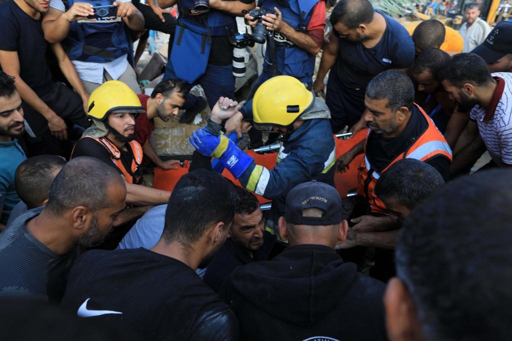 10月16日,在加沙地帶南部城市汗尤尼斯,人們?cè)谠庖陨幸u擊后的建筑廢墟中救援傷者。新華社發(fā)(亞西爾·庫(kù)迪攝)