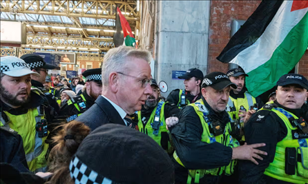當(dāng)?shù)貢r(shí)間11日,倫敦維多利亞車站,英國內(nèi)閣大臣邁克爾·戈夫在護(hù)送下經(jīng)過抗議者 圖源:《衛(wèi)報(bào)》