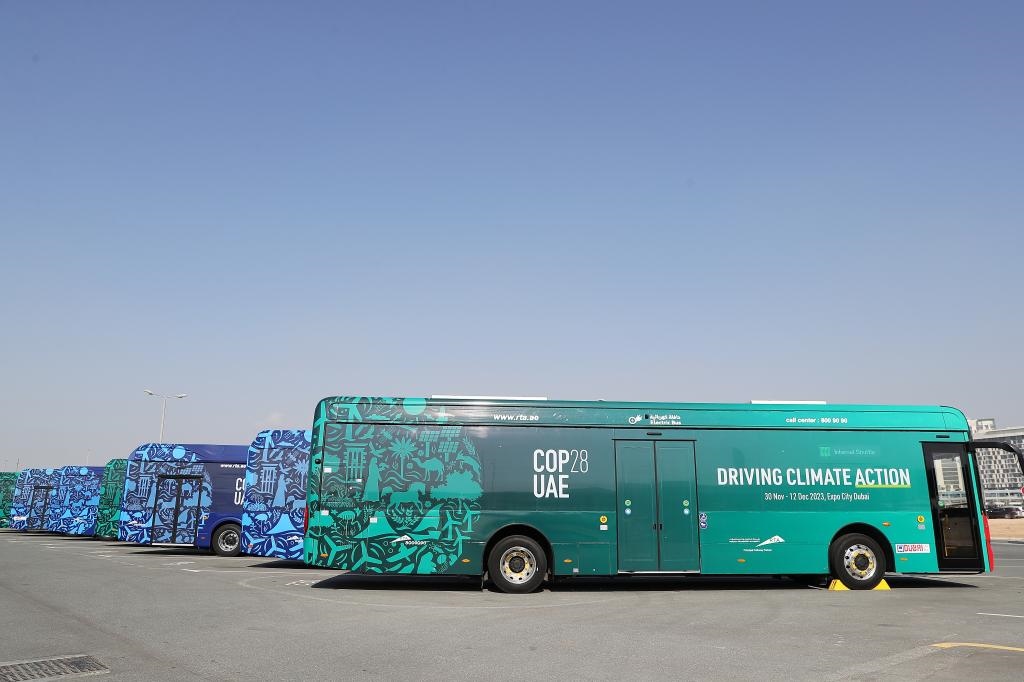 2023年12月3日,中國(guó)蘇州金龍公司的海格電動(dòng)巴士(前)??吭诼?lián)合國(guó)氣候變化迪拜大會(huì)的擺渡車(chē)停車(chē)場(chǎng)。新華社記者 王東震 攝