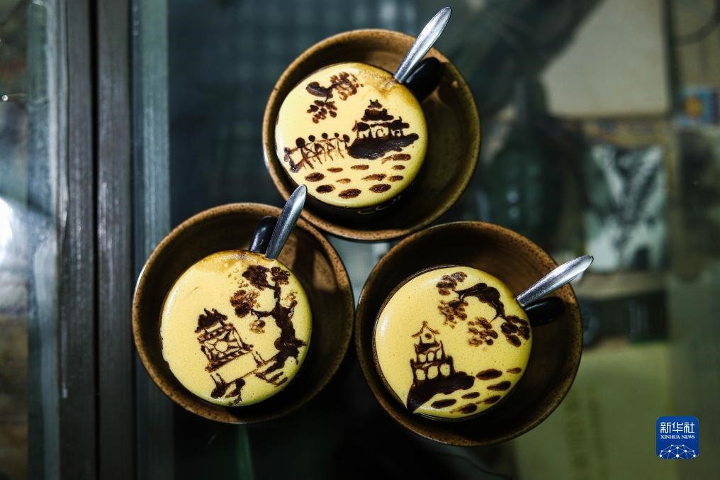 這是2023年7月22日在越南河內一家咖啡店拍攝的繪制河內風光圖案的雞蛋咖啡。越南特色飲品雞蛋咖啡由蛋黃、糖、煉乳和咖啡等原料制成,其獨特的風味受到當地民眾和外國游客喜愛。
