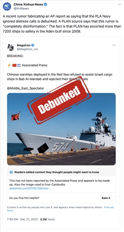 一個(gè)名為“Megatron”的擁有十多萬“粉絲”的賬號(hào)在社交平臺(tái)“X”(原推特)上說:“美聯(lián)社突發(fā)新聞!中國軍艦在曼德海峽拒絕協(xié)助以色列貨船,且無視他們的呼救。”貼文后還配了一張中國軍艦的照片。