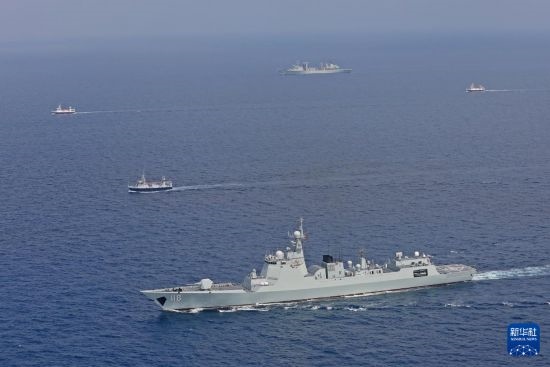中國海軍第45批護航編隊烏魯木齊艦、東平湖艦為中國漁船護航(2023年10月20日攝)。新華社發(fā)(王遠方攝)