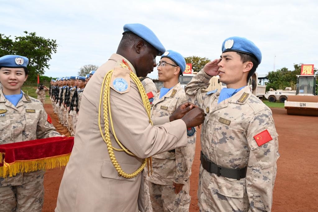 2023年10月28日,在聯(lián)合國駐南蘇丹特派團(tuán)瓦烏超級(jí)營地的中國工兵營區(qū),聯(lián)南蘇團(tuán)西戰(zhàn)區(qū)司令哈根(中)在授勛儀式現(xiàn)場授予中國維和官兵聯(lián)合國“和平榮譽(yù)勛章”。新華社發(fā)(李飛宇攝)