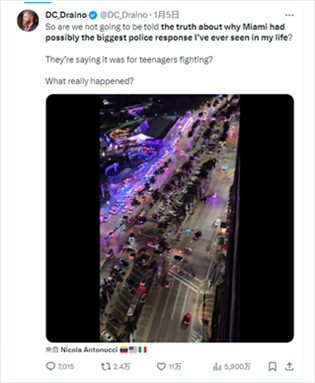 報道還提到,X平臺上另一篇帖子內(nèi)容稱,邁阿密警方此次出警執(zhí)法可能是“我一生中見過規(guī)模最大”的警方行動,然而官方?jīng)]有告知公眾真相,“他們說那是青少年打斗,到底發(fā)生了什么?”這則帖子內(nèi)容目前已獲5900萬閱讀量?!?/p>