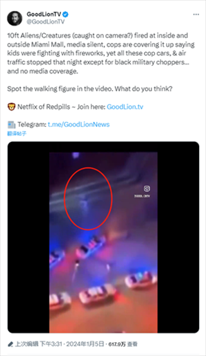 報道提到,一個推廣涵蓋科幻、陰謀論等內(nèi)容電影和紀錄片的X平臺賬號曬出現(xiàn)場視頻稱,“10英尺高的外星人/生物(被攝像機拍到?)朝邁阿密購物中心內(nèi)外開火,媒體沉默,警察掩蓋說孩子們?nèi)挤艧熁ú⒋蚨?,然而除了黑色軍用直升機,所有警車和空中交通都在那天晚上一動不動……這卻沒有媒體報道。視頻中出現(xiàn)了行走的身影。你覺得呢?”↓