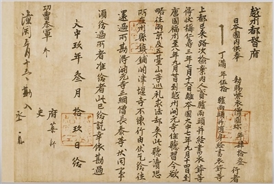 853年,圓珍入唐,先后在福州開(kāi)元寺、天臺(tái)山國(guó)清寺、長(zhǎng)安青龍寺等地修學(xué)。858年,圓珍攜大量經(jīng)卷、法器等回到日本,被尊為三井寺第一代住持,并成為日本天臺(tái)宗寺門派創(chuàng)始人。在唐求法期間,圓珍與各界人士結(jié)下深厚友誼。圓珍的親身經(jīng)歷以及他和唐朝人士的往來(lái)信件等,成為中日文化交流的歷史見(jiàn)證。