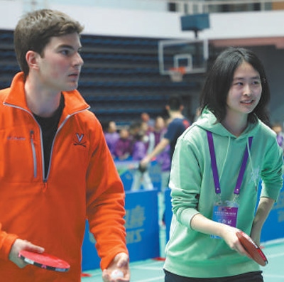 弗吉尼亞大學(xué)學(xué)生米莎與清華大學(xué)學(xué)生曾加寶組成搭檔。在練習(xí)環(huán)節(jié)中,對(duì)手朝著米莎的方向打來一記高難度弧圈球,米莎一時(shí)間有些不知所措,只聽曾加寶喊了一句“我來”,便眼疾手快地沖了過去,擋在米莎前面,接住了這個(gè)球。這有趣又溫馨的一幕,引來了現(xiàn)場(chǎng)觀眾的掌聲,也瞬間拉近了兩個(gè)年輕人的距離?!拔业拇顧n一直鼓勵(lì)我,耐心地指導(dǎo)我握拍、擊球。我們一起討論乒乓球和學(xué)業(yè),現(xiàn)在已經(jīng)成了朋友?!泵咨f。