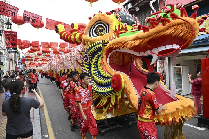 2月1日,由馬來西亞和中國的100多名青少年組成的舞龍隊在馬來西亞馬六甲市雞場街上共舞一條近200米的“長龍”。這是活動現(xiàn)場的“長龍”。新華社記者 程一恒 攝