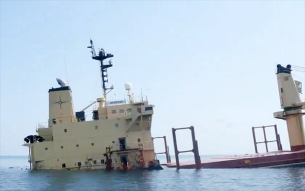 這張拍攝日期不明的照片顯示了英國貨輪“魯比馬爾”號沉沒前的景象。新華社發(fā)(也門政府供圖)