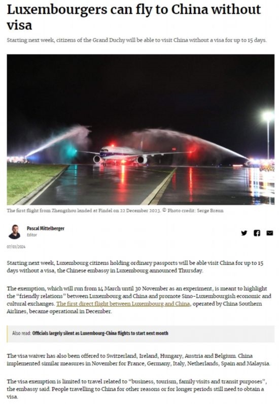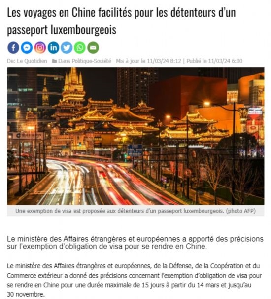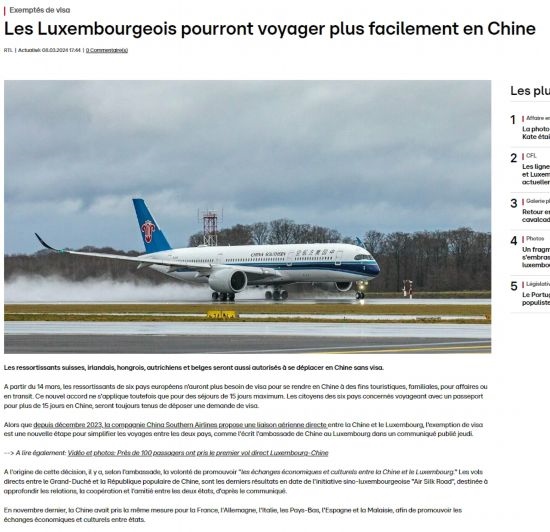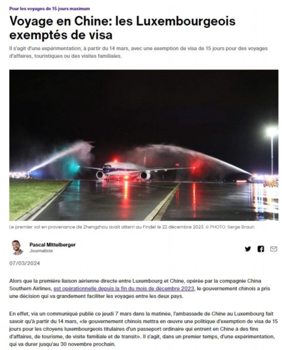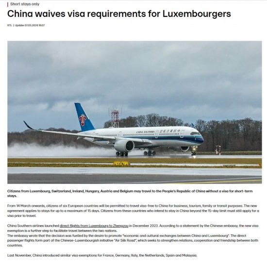 近日,中國(guó)政府決定自2024年3月14日0時(shí)起至2024年11月30日24時(shí),對(duì)包括盧森堡在內(nèi)的6國(guó)持普通護(hù)照人員實(shí)行部分免簽。中國(guó)駐盧使館及時(shí)向盧外交部等部門(mén)和主流媒體作了通報(bào),盧政府和媒體對(duì)中方免簽政策予以高度評(píng)價(jià)。