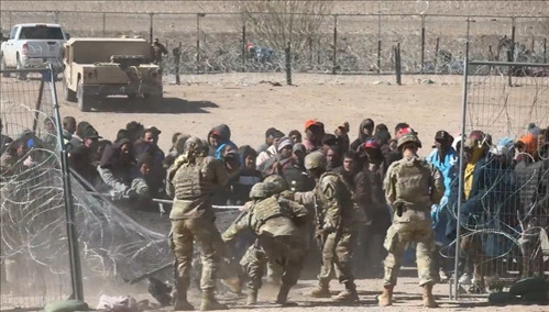 視頻畫面顯示,大批成年男性沖破州政府設(shè)置的鐵絲網(wǎng),將得州國民警衛(wèi)隊(duì)的一些士兵撞倒,并跑向邊界墻。 現(xiàn)場(chǎng)一片混亂,可以聽到有士兵對(duì)移民大叫“滾回去!”